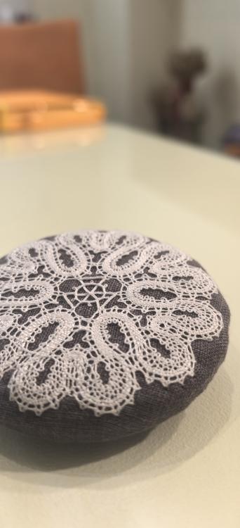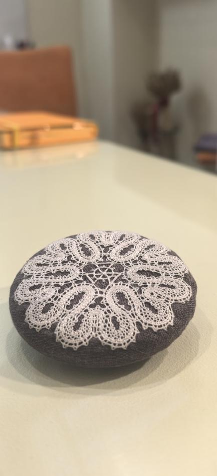 Брошь выполнена из ручного кружева на льняной основе.