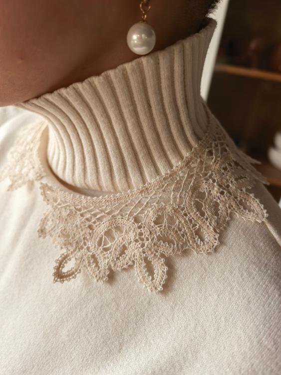 Воротник, выполненный из ручного вологодского кружева. Миниатюрность воротника позволит ему быть отделкой или манжетом, все ограничится только фантазией хозяйки, а интересный оттенок делает его мягким и интересным.